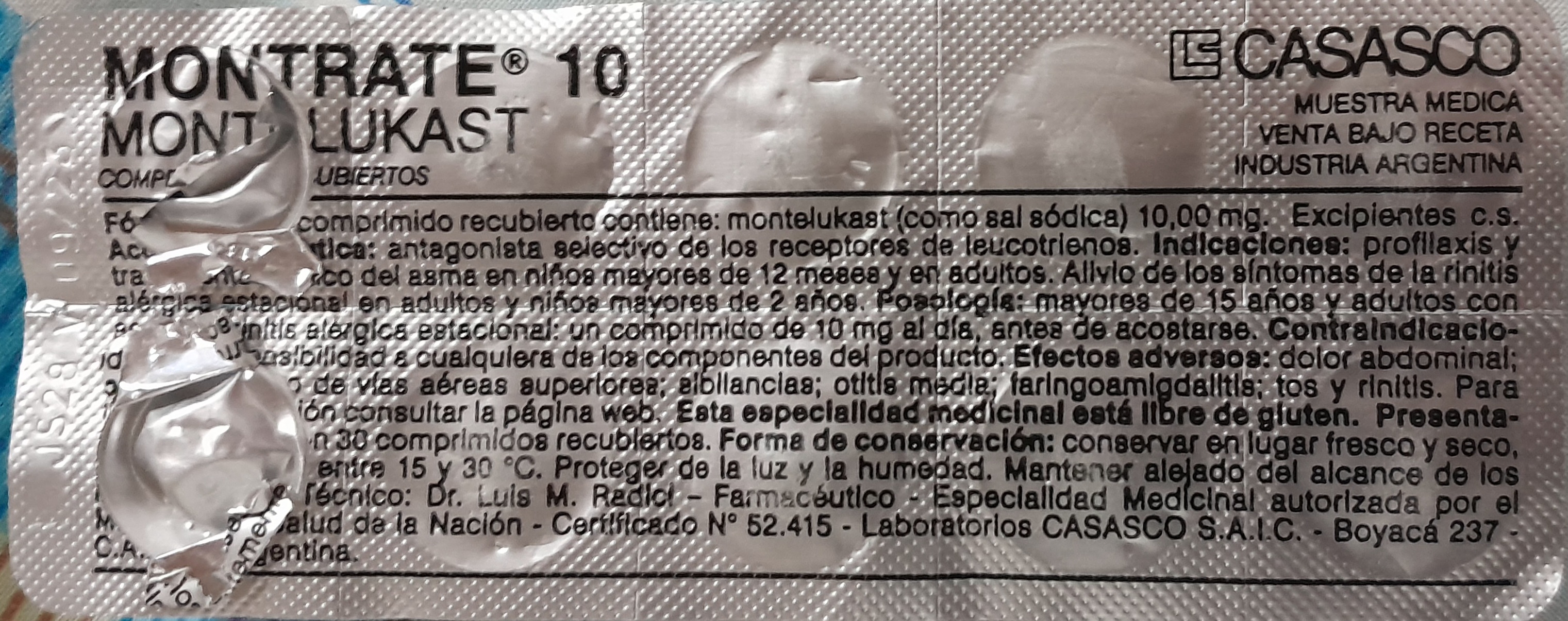Comprimidos recubiertos x 10mg: cada comprimido recubierto contiene: montelukast (como sal sódica) 10mg. Excipientes: cs. Comprimidos masticables x 4mg: cada comprimido masticable contiene: montelukast (como sal sódica) 4mg. Excipientes: cs. Comprimidos masticables x 5mg: cada comprimido masticable contiene: montelukast (como sal sódica) 5mg. Excipientes: cs. Granulado: cada sobre contiene: montelukast (como sal sódica) 4,00mg. Excipientes cs.