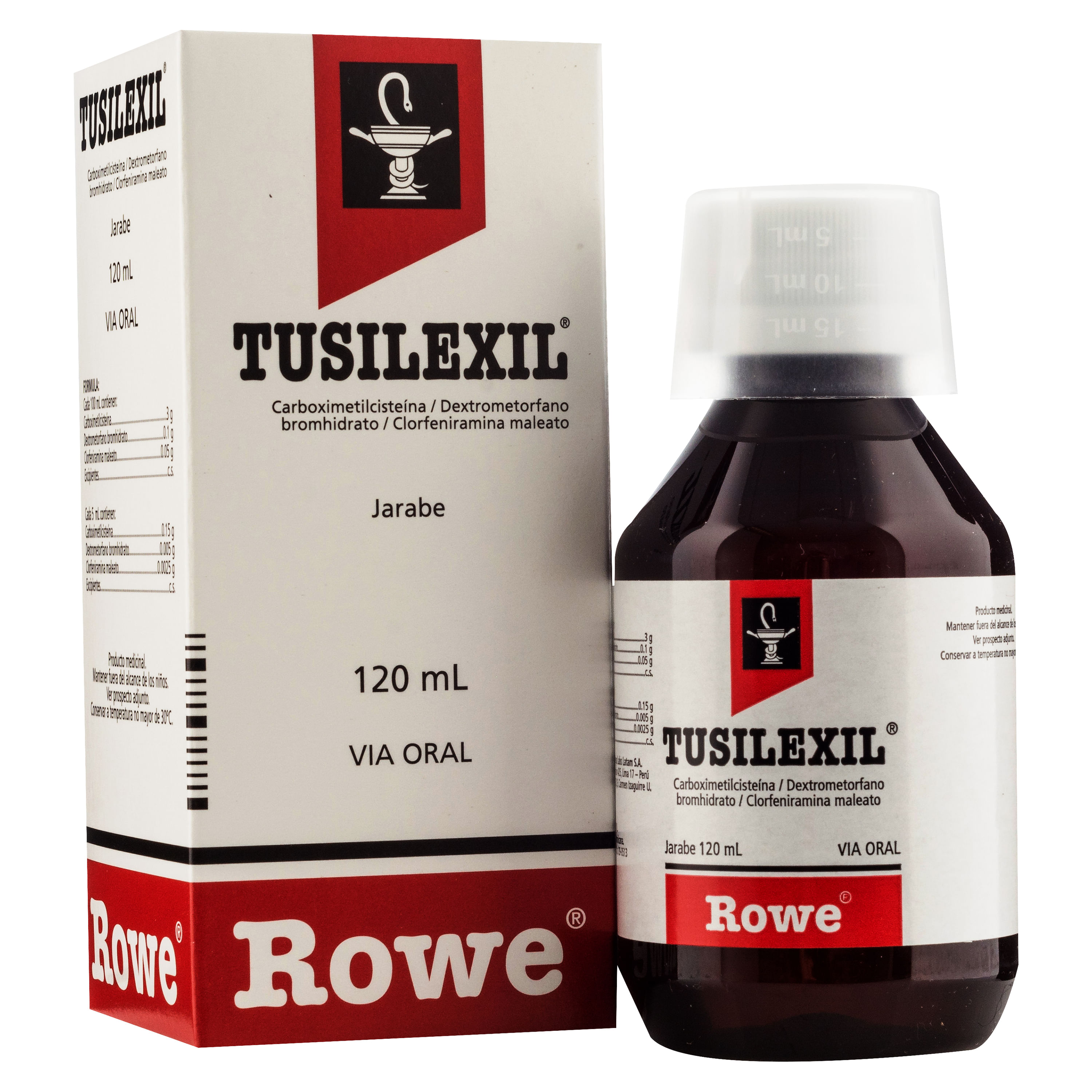 TUSILEXIL es un medicamento antitusivo fabricado por el laboratorio Rowe, disponible en Perú. Combina tres principios activos: carboximetilcisteína, que actúa como mucorregulador y expectorante ayudando a fluidificar las secreciones; dextrometorfano, que alivia la tos al actuar sobre el reflejo tusígeno; y clorfeniramina, un antihistamínico que reduce la congestión nasal y las manifestaciones alérgicas. Gracias a esta combinación, TUSILEXIL aborda varios síntomas respiratorios de forma simultánea.